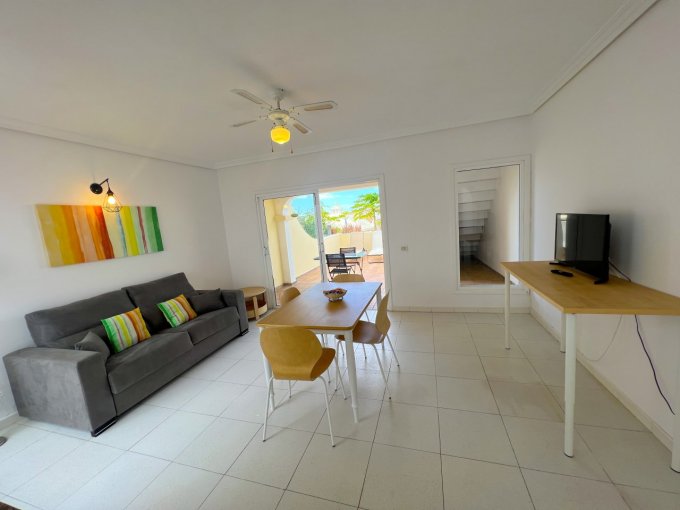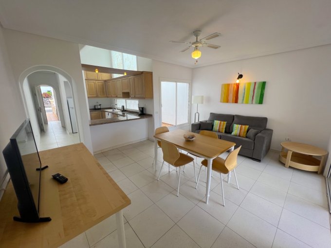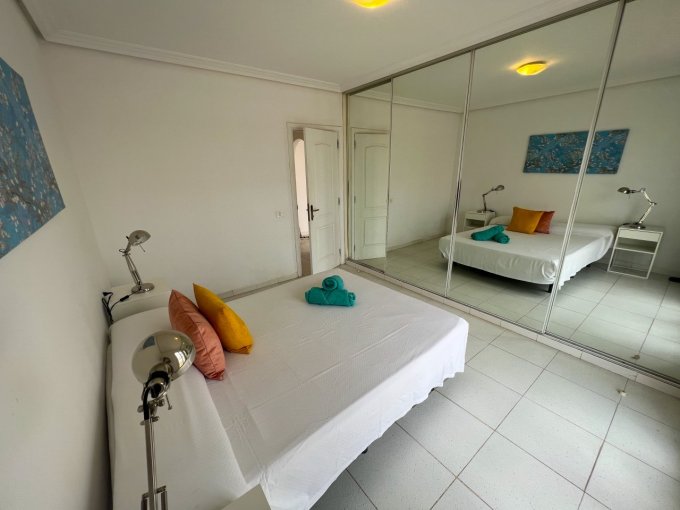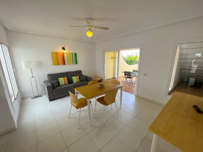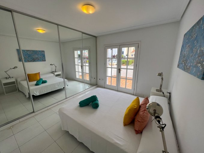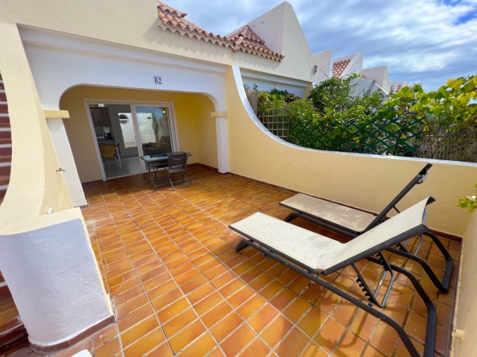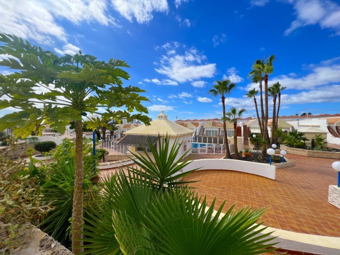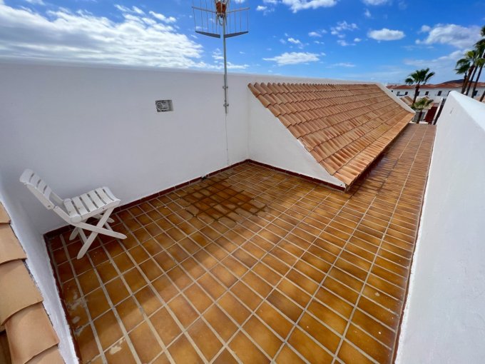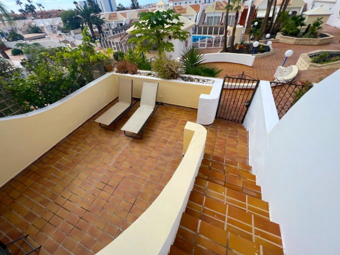 Morfitt Properties Tenerife are pleased to offer for sale this bungalow style apartment located on the popular complex The Palms in Los Cristianos. The property offers an entrance hall with storage, a double bedroom with fitted wardrobes and its own terrace with morning sun. There is a large family bathroom, guest toilet, galley-style kitchen and lounge / diner leading to a god size terrace with access to a small roof terrace. The terrace from the lounge has access to the communal gardens and 4 communal swimming pools, one of them heated. The apartment has the potential to convert to a 2 bedroom apartment, many of the properties on The Palms have already made the reform. The apartment is sold unfurnished.