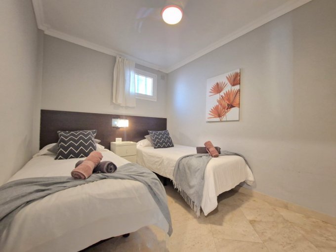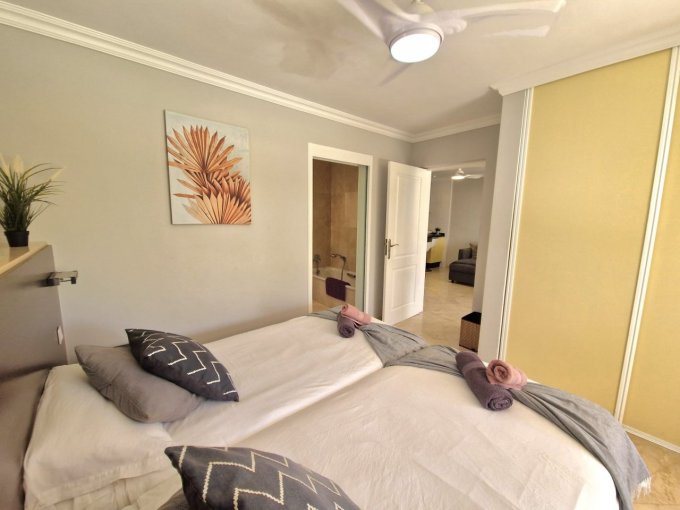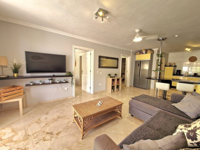 Morfitt Properties Tenerife are pleased to offer for sale a 2 bedroom, 2 bathroom apartment on Parque Santiago 4 which is one of the very best complexes in Tenerife. The property has a large lounge with open kitchen with patio doors which lead to a double terrace which enjoys sunshine most of the day. The bedrooms are double and both ensuites, the master with shower and a bath. The second bedroom has a shower cubicle. The kitchen is fully equipped and has a large breakfast bar for dining. The large terrace area has lots of space for al fresco dining as well as sunbathing and leads to the heated swimming pool, sunbathing terraces and then to the pool bar and restaurant which is near the fully managed 24 hour reception.