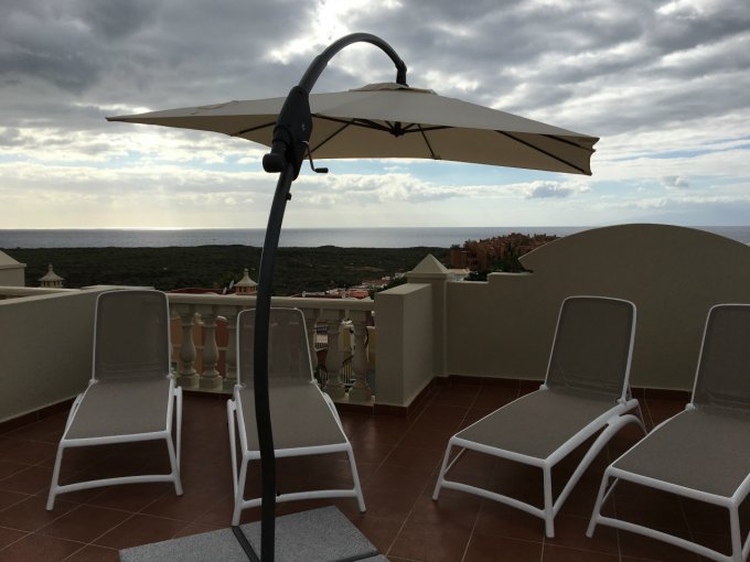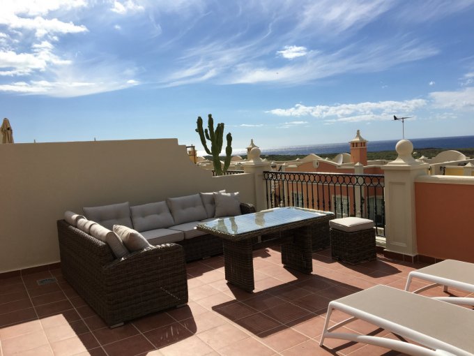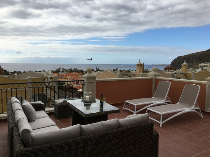 Morfitt Properties Tenerife are pleased to offer for sale a corner duplex penthouse apartment in the popular complex of Paraiso del Palm Mar, with a roof terrace and excellent sea views. There are 4 terraces in total measuring 119M2. The property offers two bedrooms on the ground floor and a bathroom with a shower-room, plus access to the first terrace. On the 1st floor, spacious living room and fully equipped modern kitchen, guest bathroom, access to terraces, one on the east side and one on the west side to enjoy the sun in the morning and in the afternoon. From the sunny roof terrace all day you have a beautiful view of the sea and the island of La Gomera. Distance to the beach and the sea 400M. Price includes a parking space.