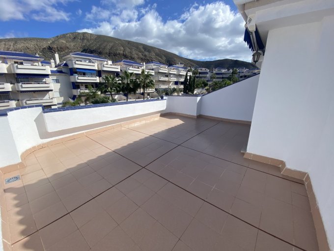 Morfitt Properties Tenerife are pleased to offer for sale this penthouse duplex apartment in Playa Graciosa 2 in Los Cristianos. The apartment offers entrance, fully fitted kitchen, double bedroom with fitted wardrobes and en-suite bathroom, and a lounge / diner with access to the lower terrace. The upper level offers shower-room, open space which could be utilized as a 2nd bedroom / office and has access to a large sunny roof terrace. From both terraces there are great views of the communal gardens up towards the communal swimming pool. The apartment is sold as seen and comes with electric shutters, air-conditioning, inter-com system and included in the sales price is a parking space and store-room. The complex Playa Graciosa 2 is well kept and offers gated entrance, beautiful gardens and communal pools, and is a short walk to the sea front.