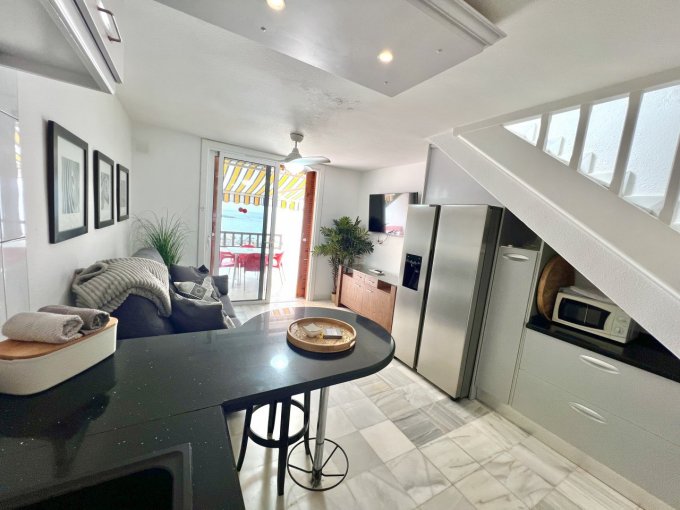 The duplex apartment features an entrance hall, a guest shower room, a fully fitted kitchen, and a lounge with access to a sunny terrace boasting amazing views. The upper level offers a double bedroom, an en-suite bathroom, and a private terrace, again with stunning sea and beach views!