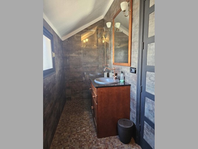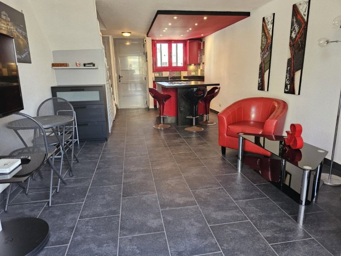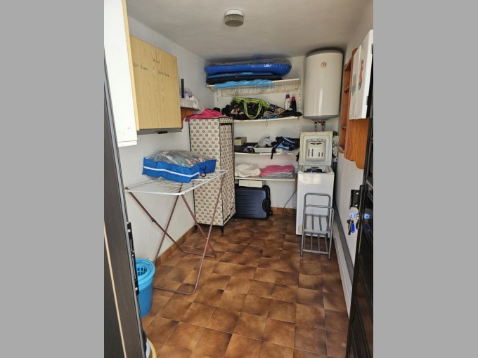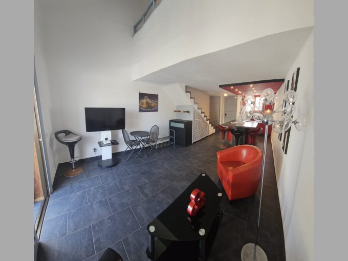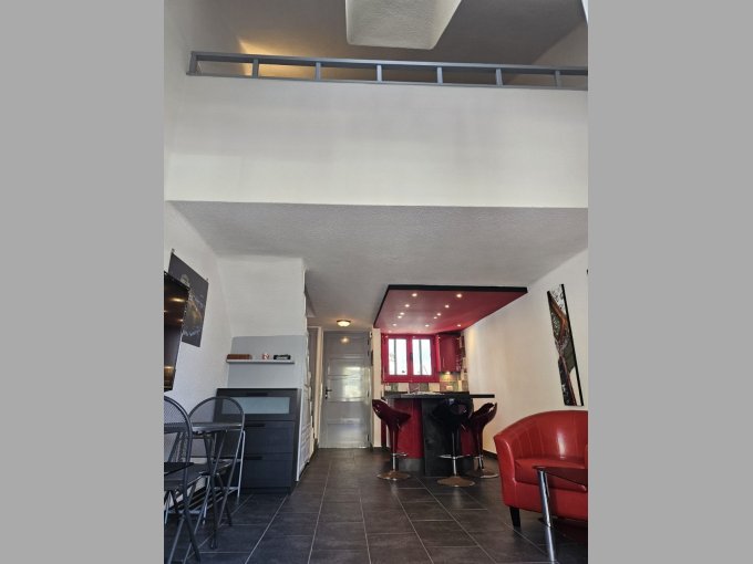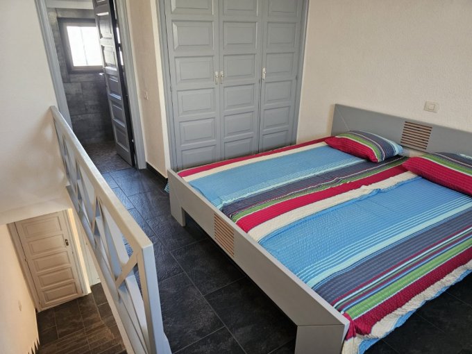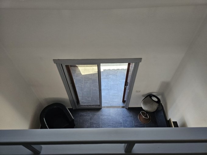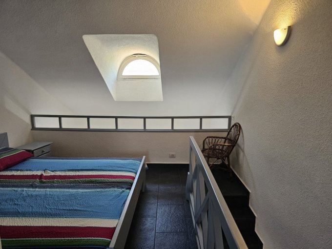 On the entrance level, the apartment features an open-plan living area with a fully fitted kitchen and lounge, leading to a sunny terrace with lateral sea views. Upstairs, there is a double bedroom with fitted wardrobes and a modern shower room.