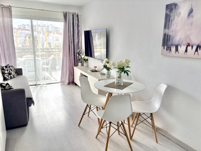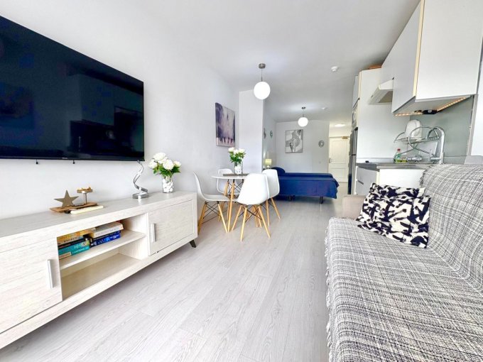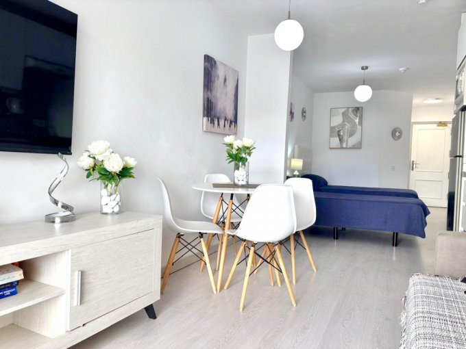 The studio is air-conditioned and sold fully furnished. It features a modern kitchen, a contemporary shower room, and a bright, comfortable living/sleeping area, as well as a small private balcony.