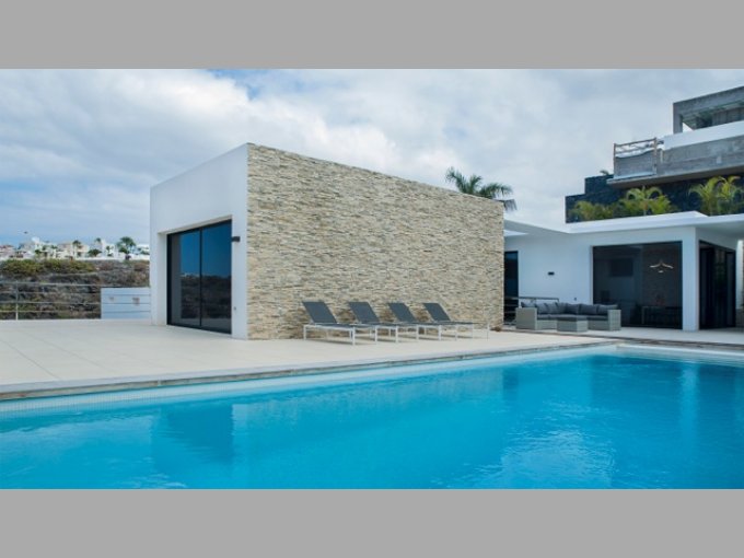 Villa Chiara is a stunning and unique property located in the exclusive Costa Adeje, in the picturesque golf resort of La Caleta. The quirkiness and personality of this villa is given by the modern, minimalist design, and the distribution of space and elements, so perfectly integrated in the mild climate of the island, creates an eccentric air of privacy. With views to the coast and the sea, to the mountains and the particular rocky terrain of the location, villa Chiara has sophisticated and layered outdoor space. The top floor is modern and architectural with solid arches covering a spacious terrace, the private pool area accommodates several chaise longue, a comfortable patio with space for table and chairs. The lower terrace is a spacious green, artificial grass plot, has the potential of becoming a private lush garden, that separates this oasis of comfort from the wild beautiful ravine in front of it. It also has a cozy barbecue setup for chill out with family and friends with panoramic views of the coast. The luxurious 4 bedrooms with en-suite bathrooms, have private outdoor space and terraces, and could be easily used for family members or transformed for guests, or temporary tenants. The properties has also two kitchens: a large one with generous storing space and dining areas, and the second one, a smaller, fully fitted, part of the living room area. With overall excellent quality details, very private, luxury immersed, this is a must-own unique property in La Caleta, Costa Adeje.