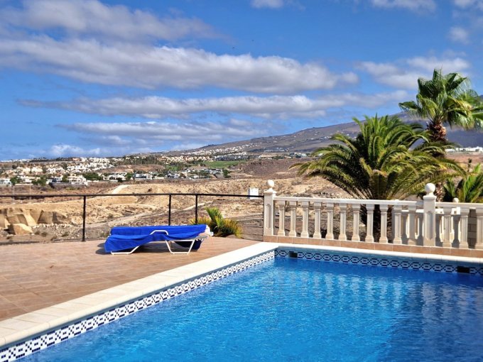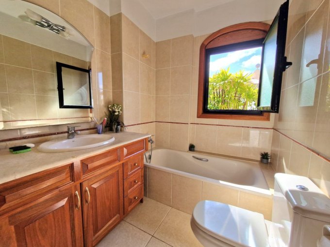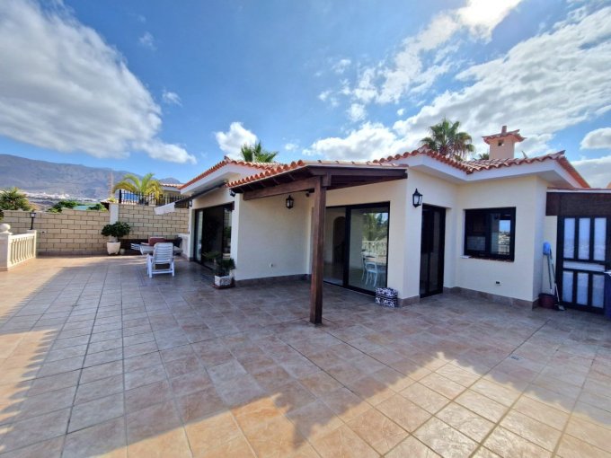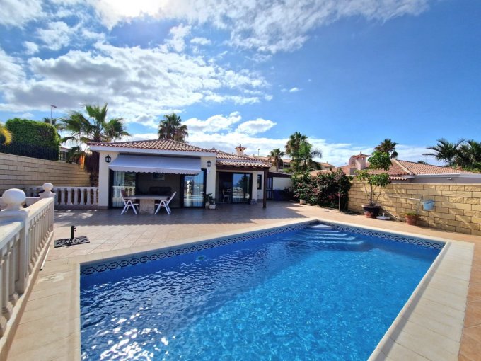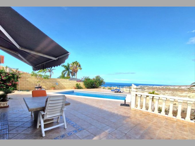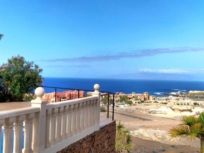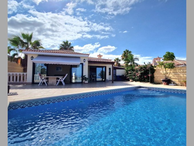 Morfitt Properties Tenerife are pleased to offer for sale this 3 bedroom villa in the exclusive area of Playa Del Duque. The property is situated on its own plot of 430m2 offering private garage, sunny terraces, private heated pool, garden area and spectacular views including, Adeje Golf, coast line, sea and the neighboring island of La Gomera. The interior of the property is constructed over 2 levels and offers on entrance level, hall, 2 double bedrooms both with fitted wardrobes, one with en-suite bathroom, guest bathroom and open plan living area with fully fitted kitchen, dining area and lounge. There is access to a outside area/terrace from all main rooms on this level. On the lower level you will find a utility room, small room which can be used for storage/office etc.It has a large 2nd lounge, and a large master bedroom with fitted wardrobes and en-suite bathroom.This property is located in one of the most sought after areas in the south of Tenerife, viewing highly recommended.