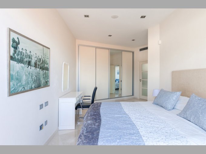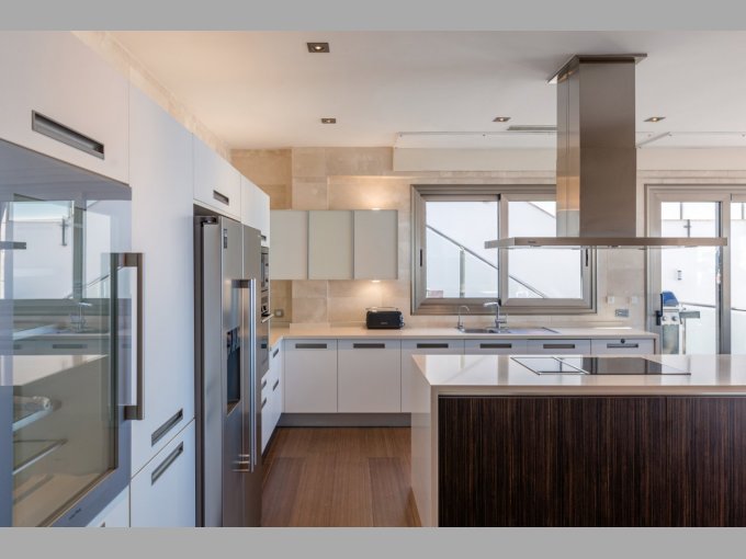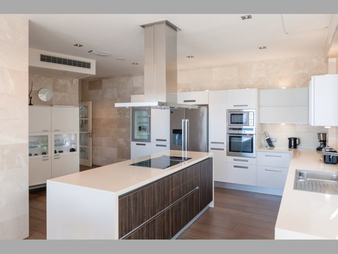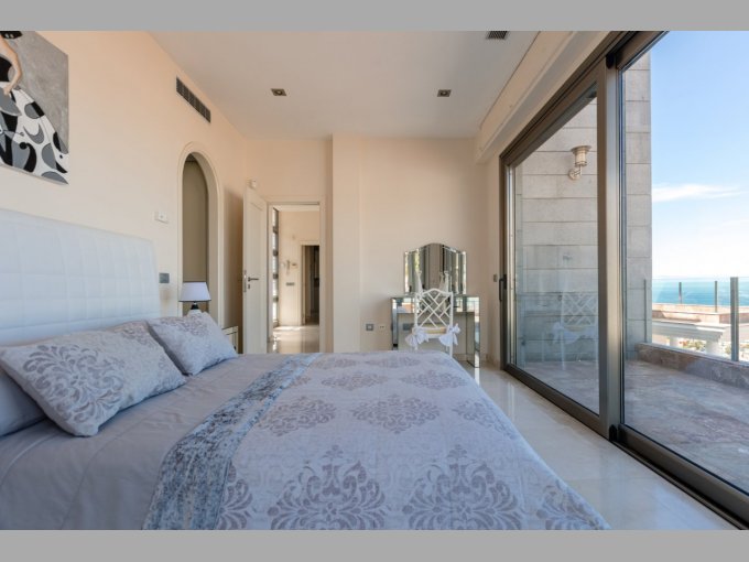 The middle floor is the main open plan living area, consisting of a dining area, lounge and sitting room all with glass doors to the stunning terrace and pool area. The modern kitchen has white high gloss units, central island, American style fridge, wine cooler and much more. Two further generous en suite bedrooms with fitted wardrobes are located on this level, each with access to the terrace providing more wondrous views.